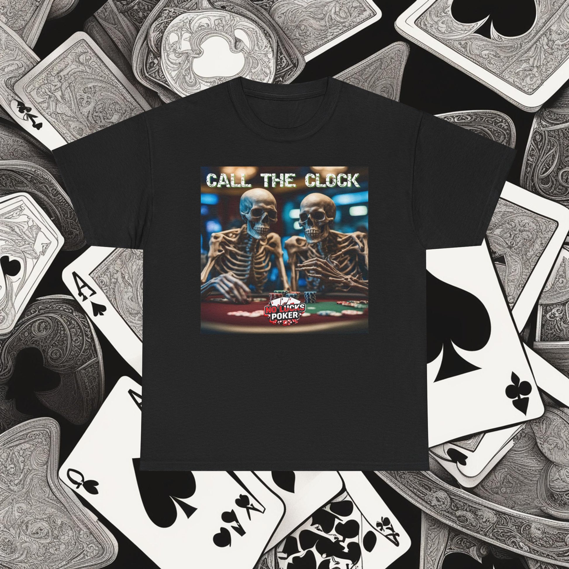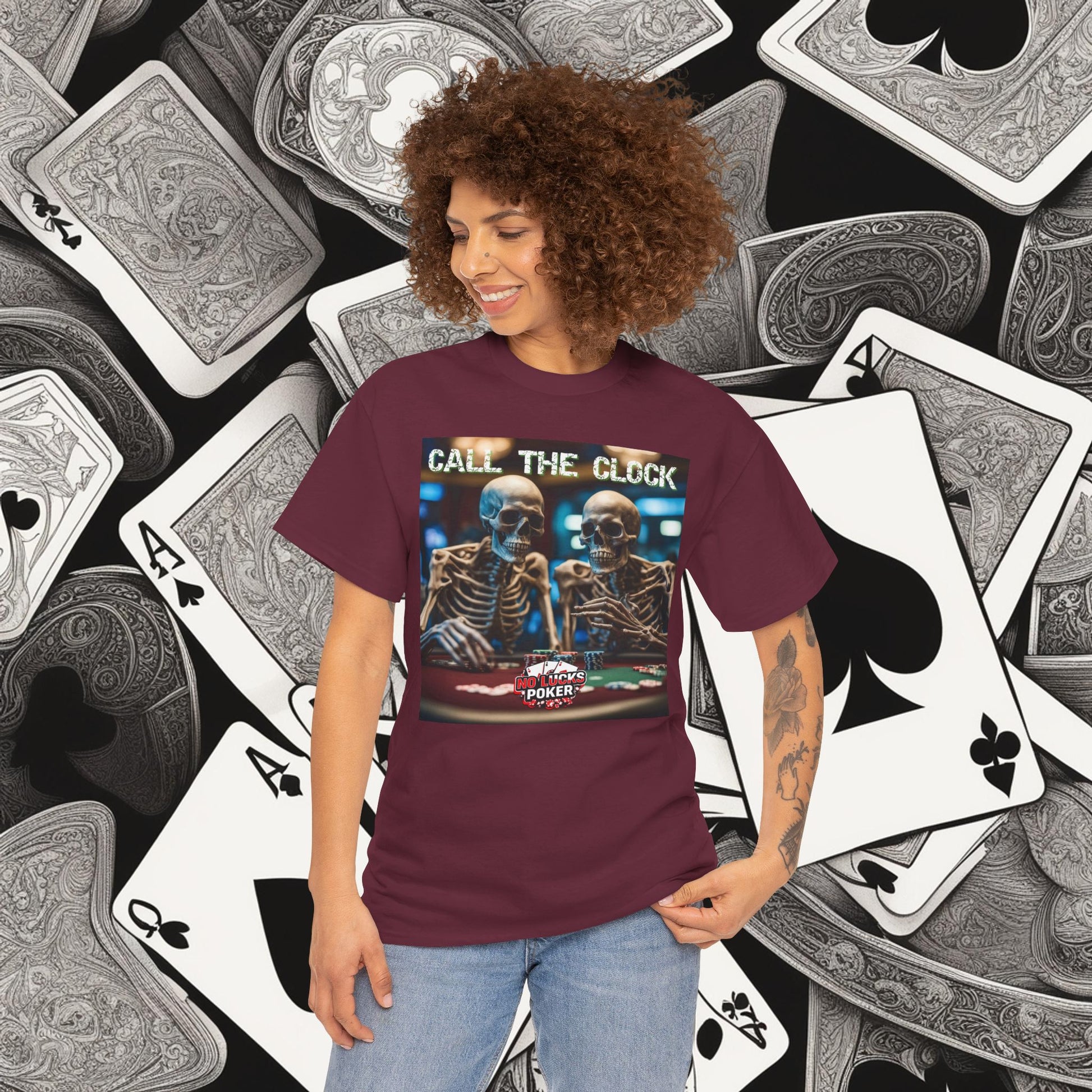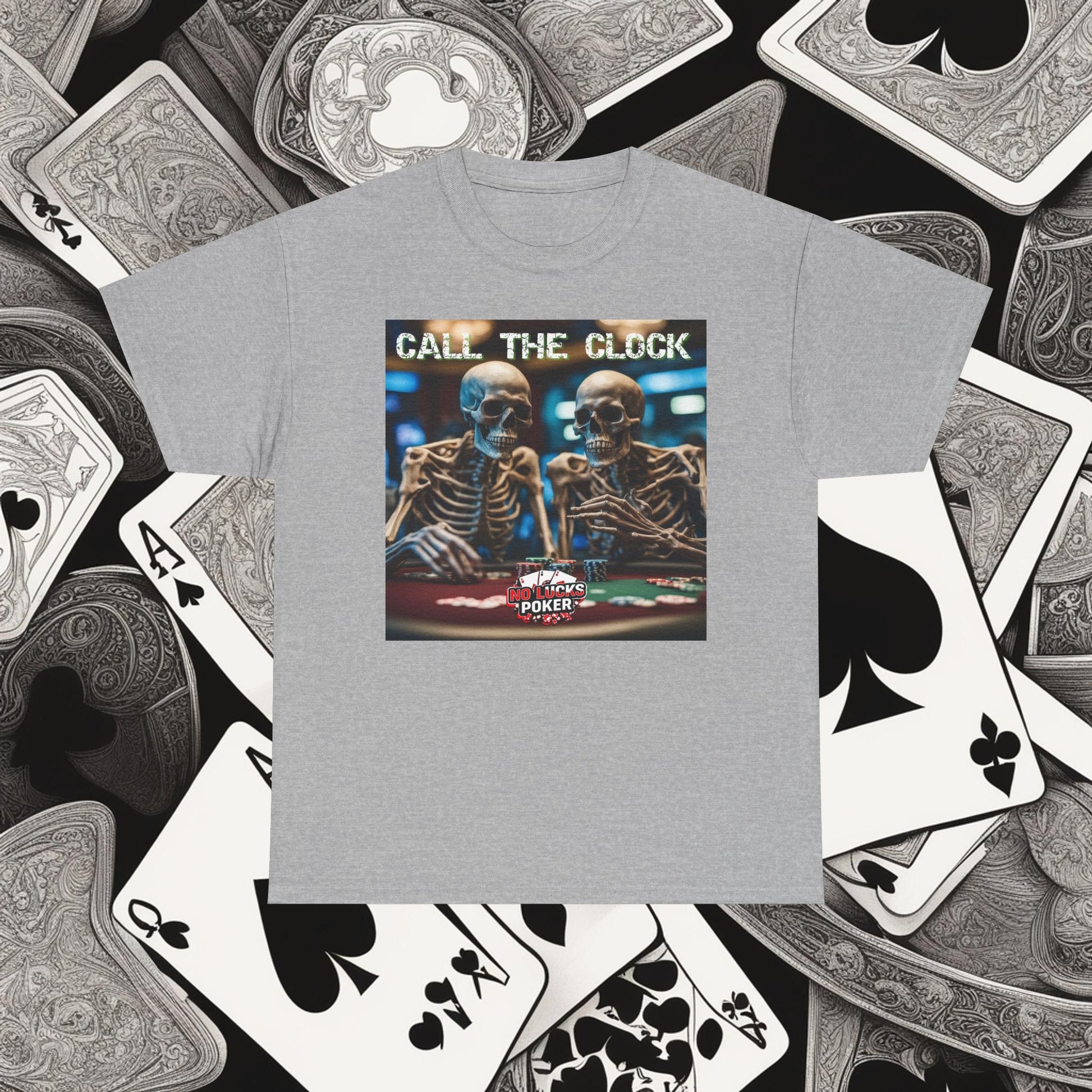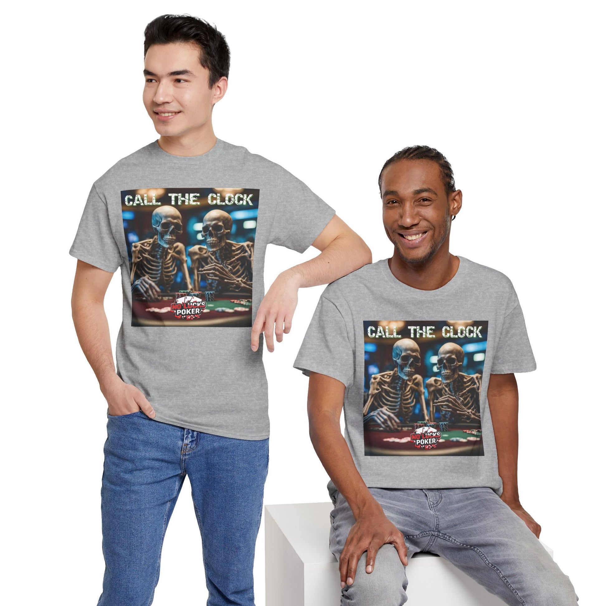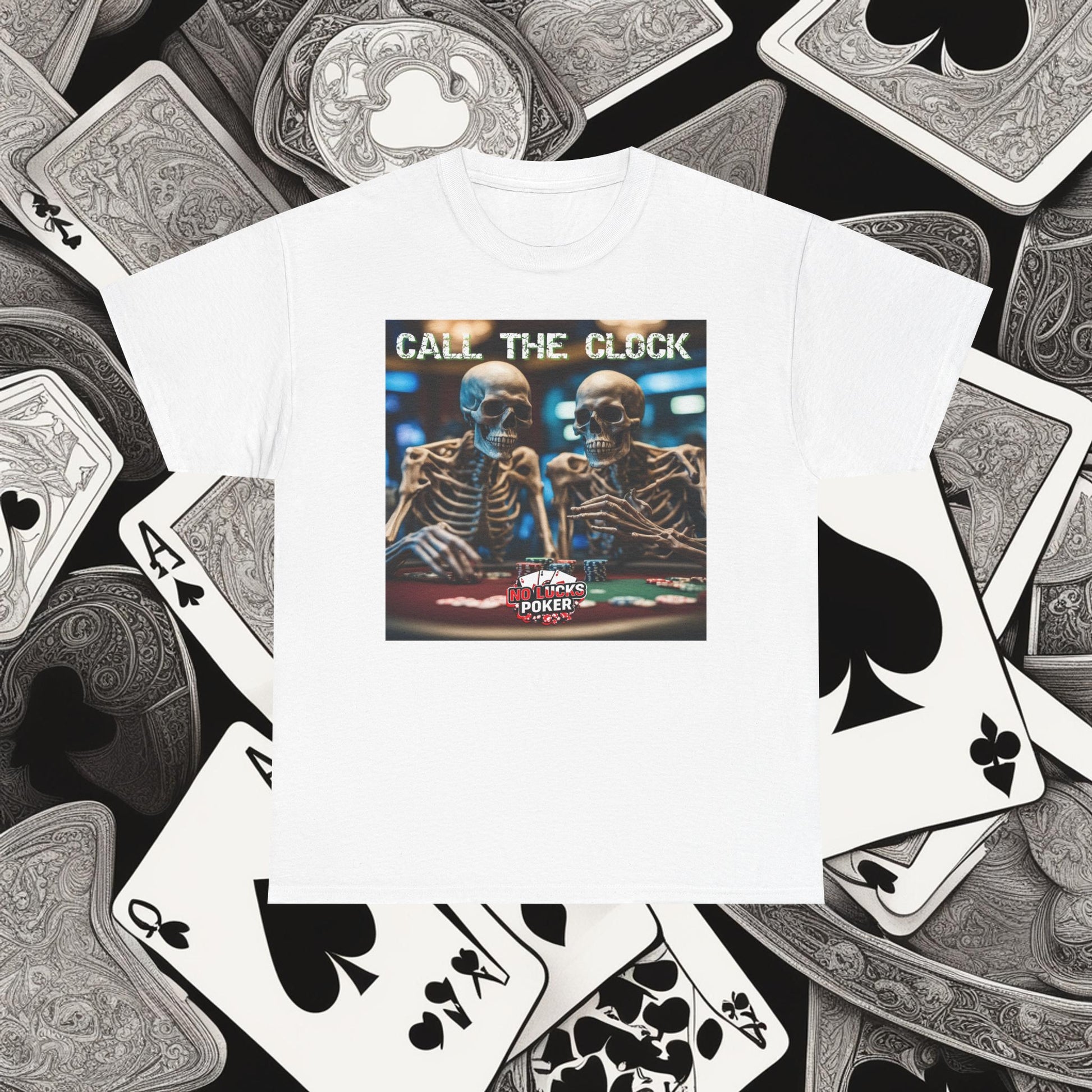 Step up your poker game with the "Call the Clock Skull" Unisex Heavy Cotton T-Shirt. Designed for players who live by skill and strategy, this tee embodies the fearless spirit of going all-in without relying on luck.