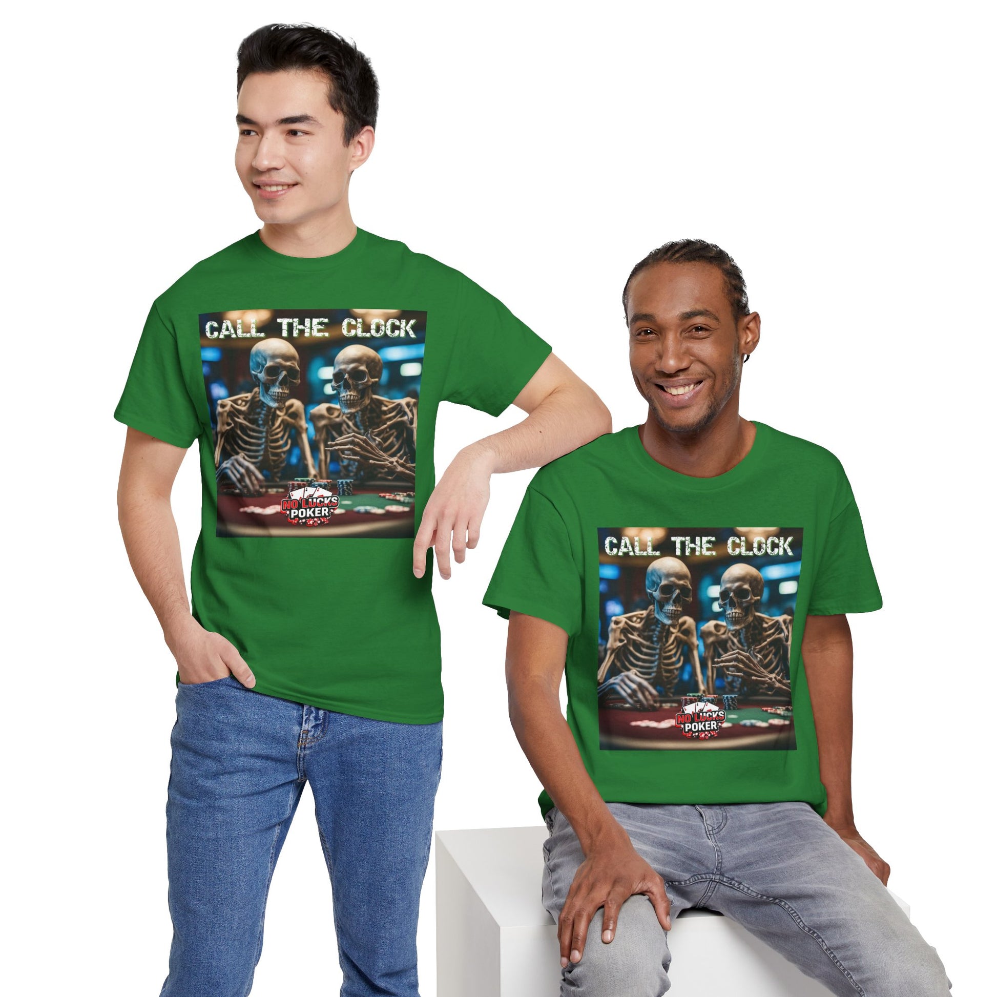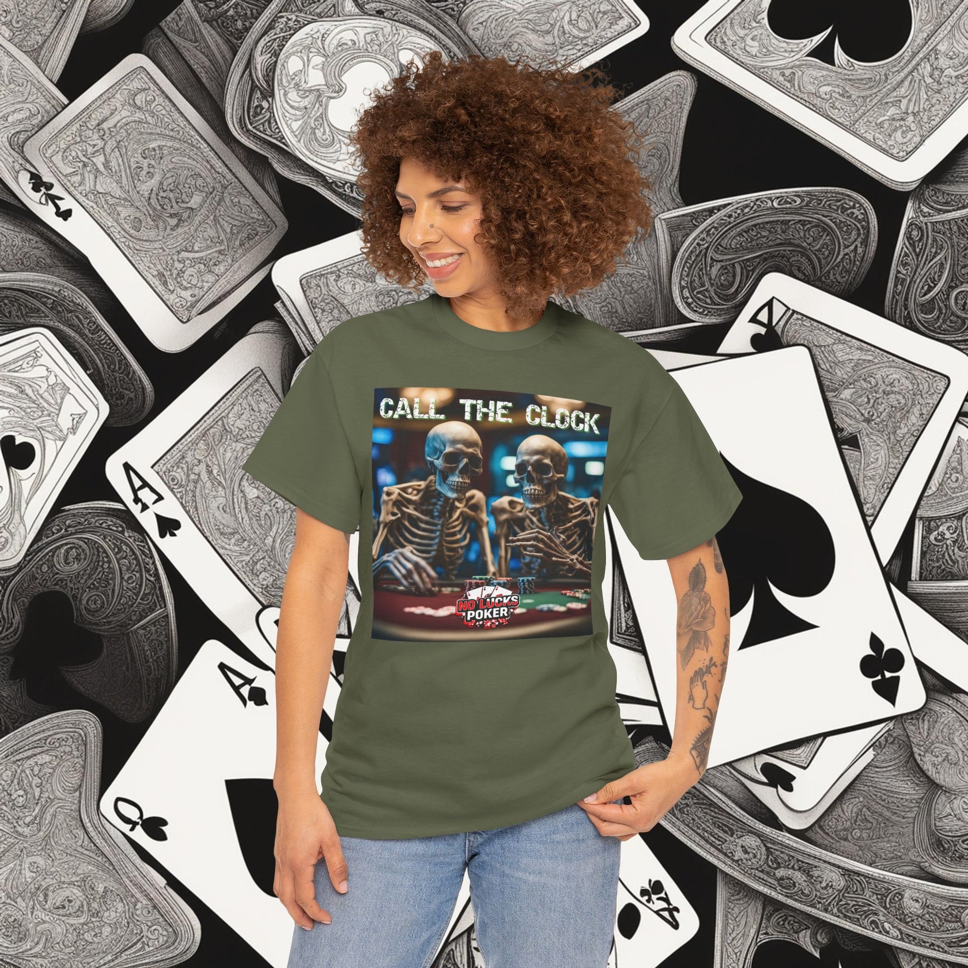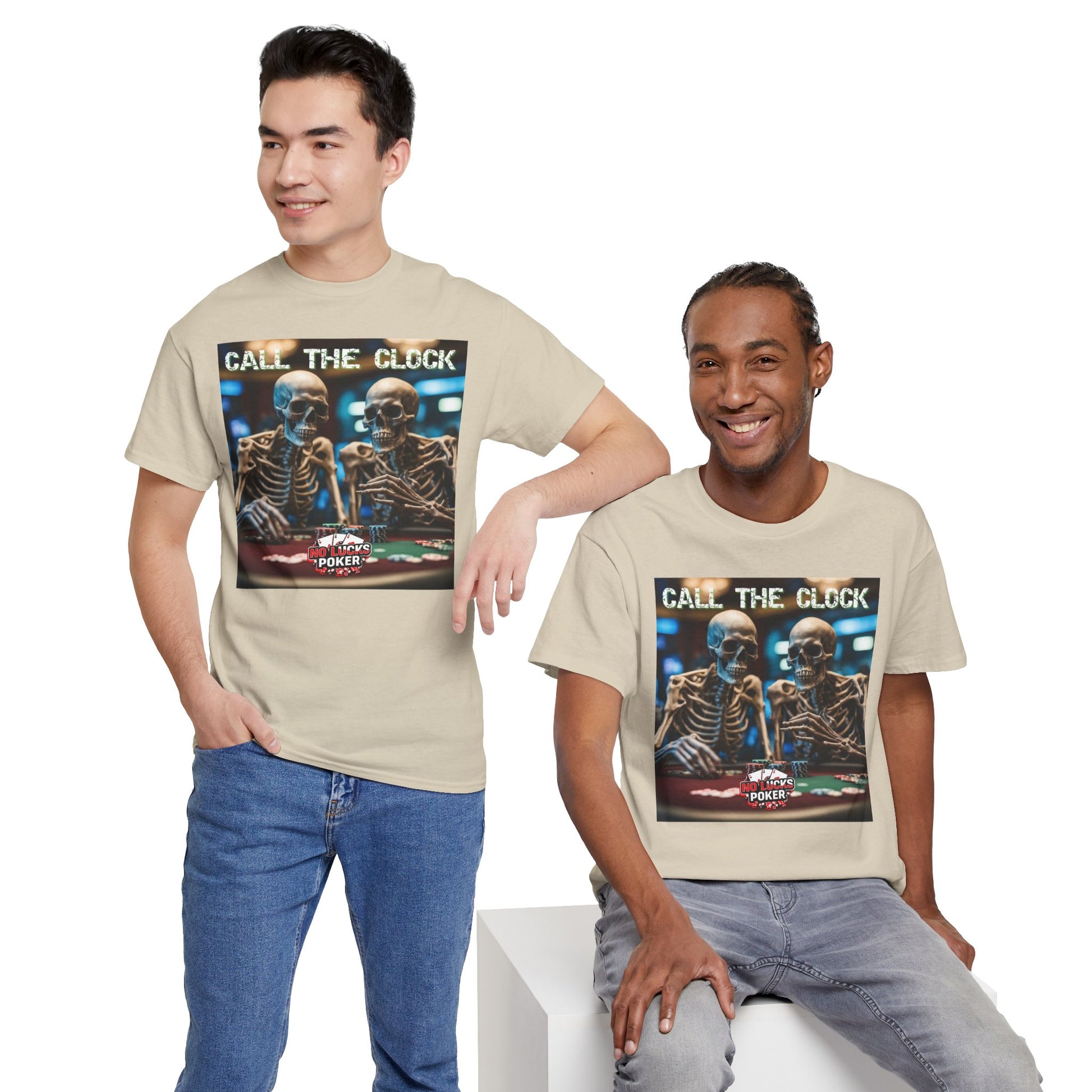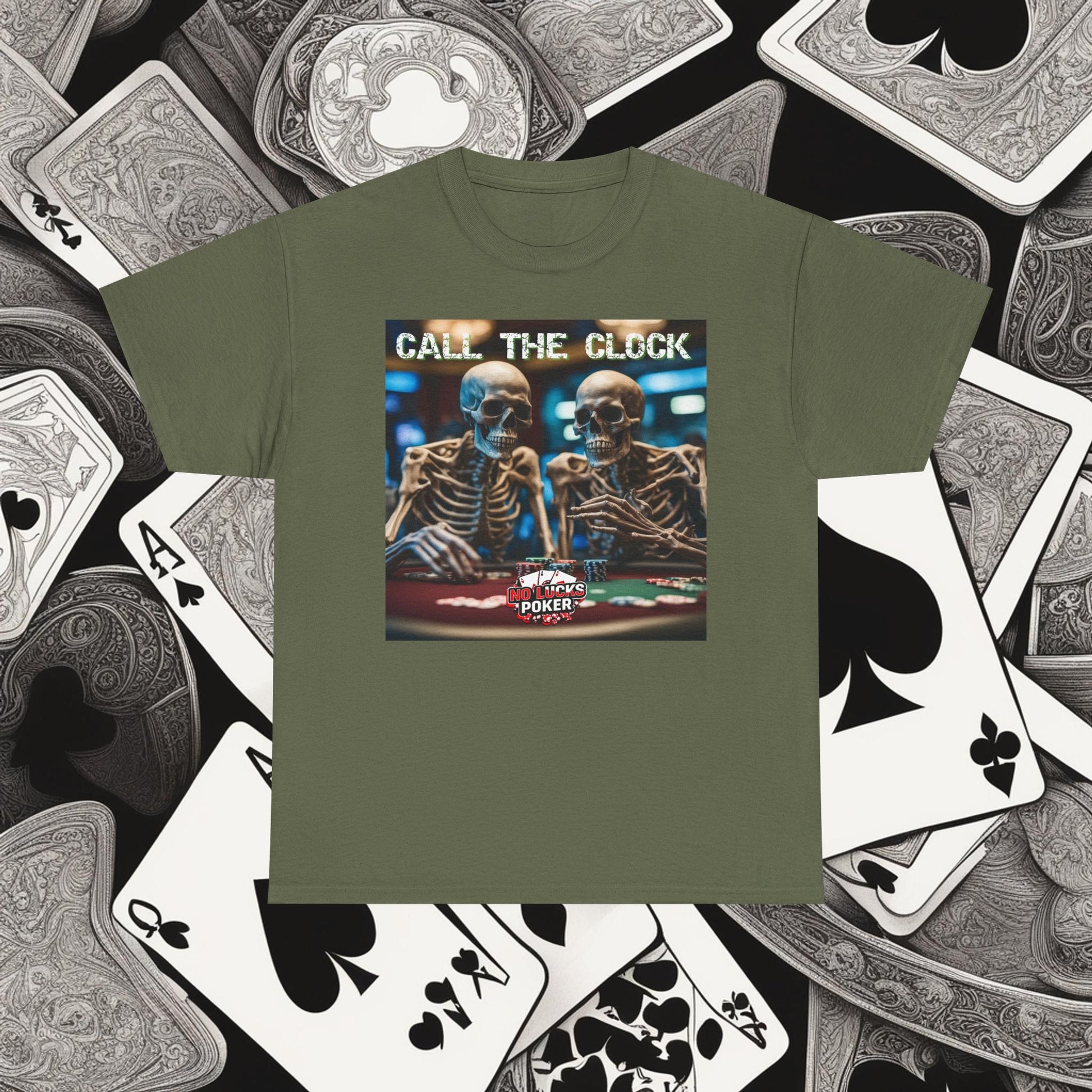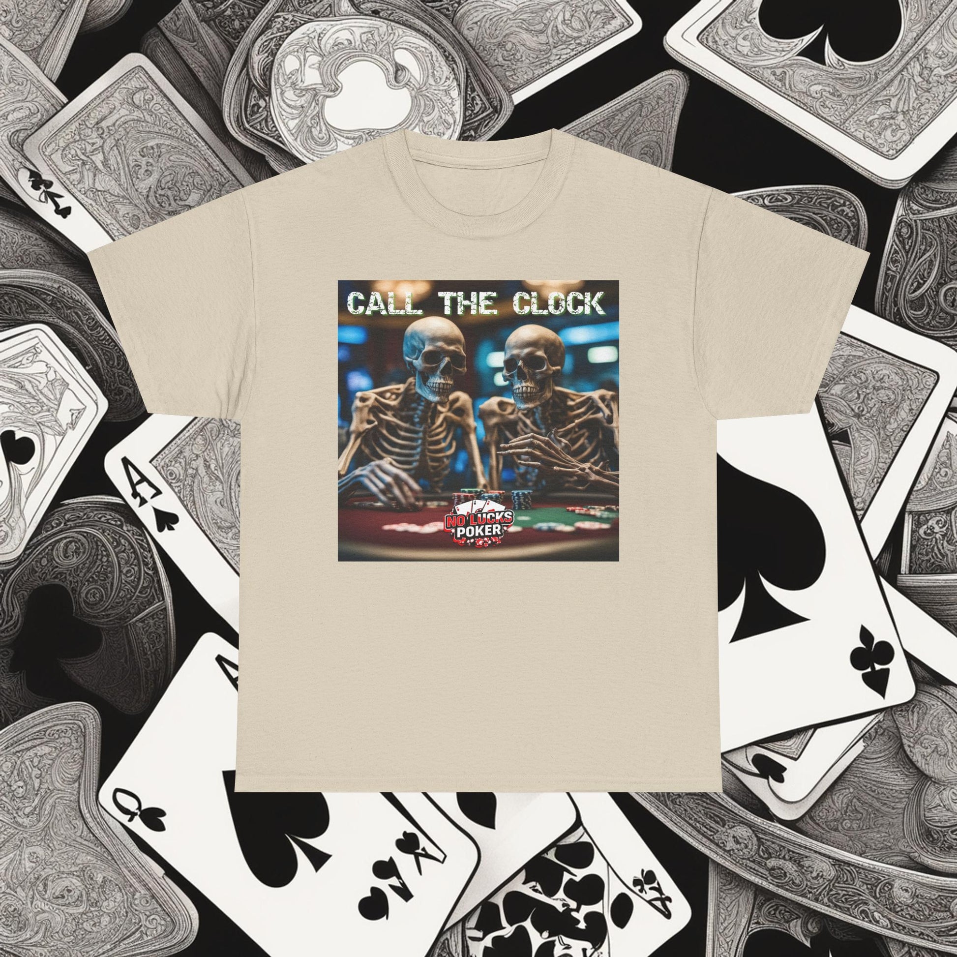Step up your poker game with the "Call the Clock Skull" Unisex Heavy Cotton T-Shirt. Designed for players who live by skill and strategy, this tee embodies the fearless spirit of going all-in without relying on luck.