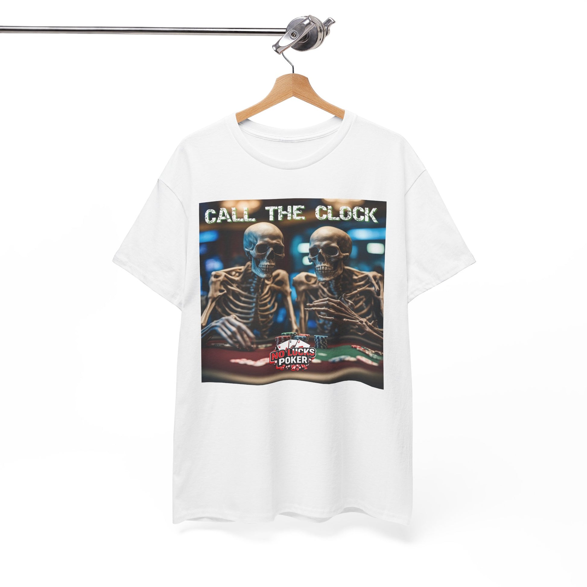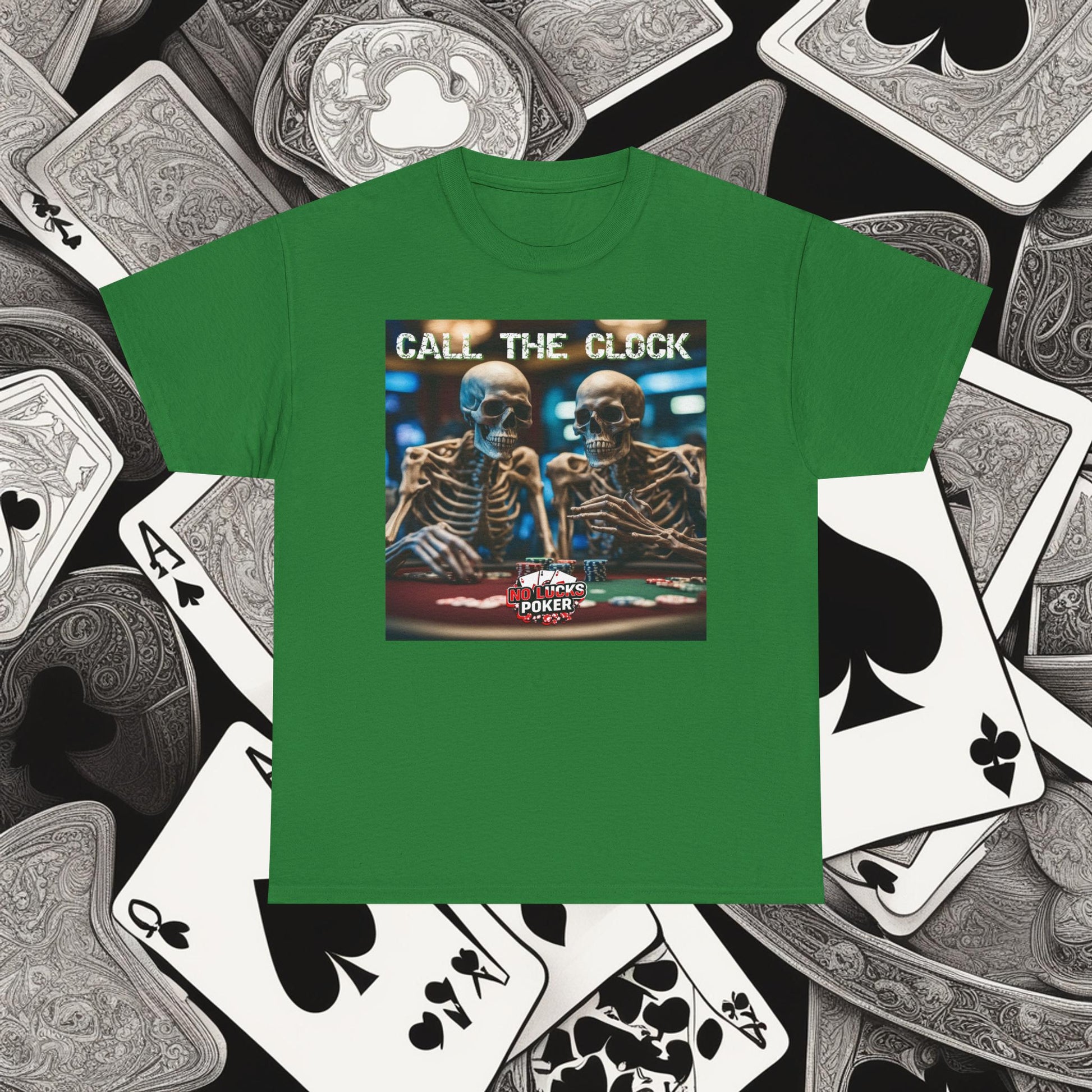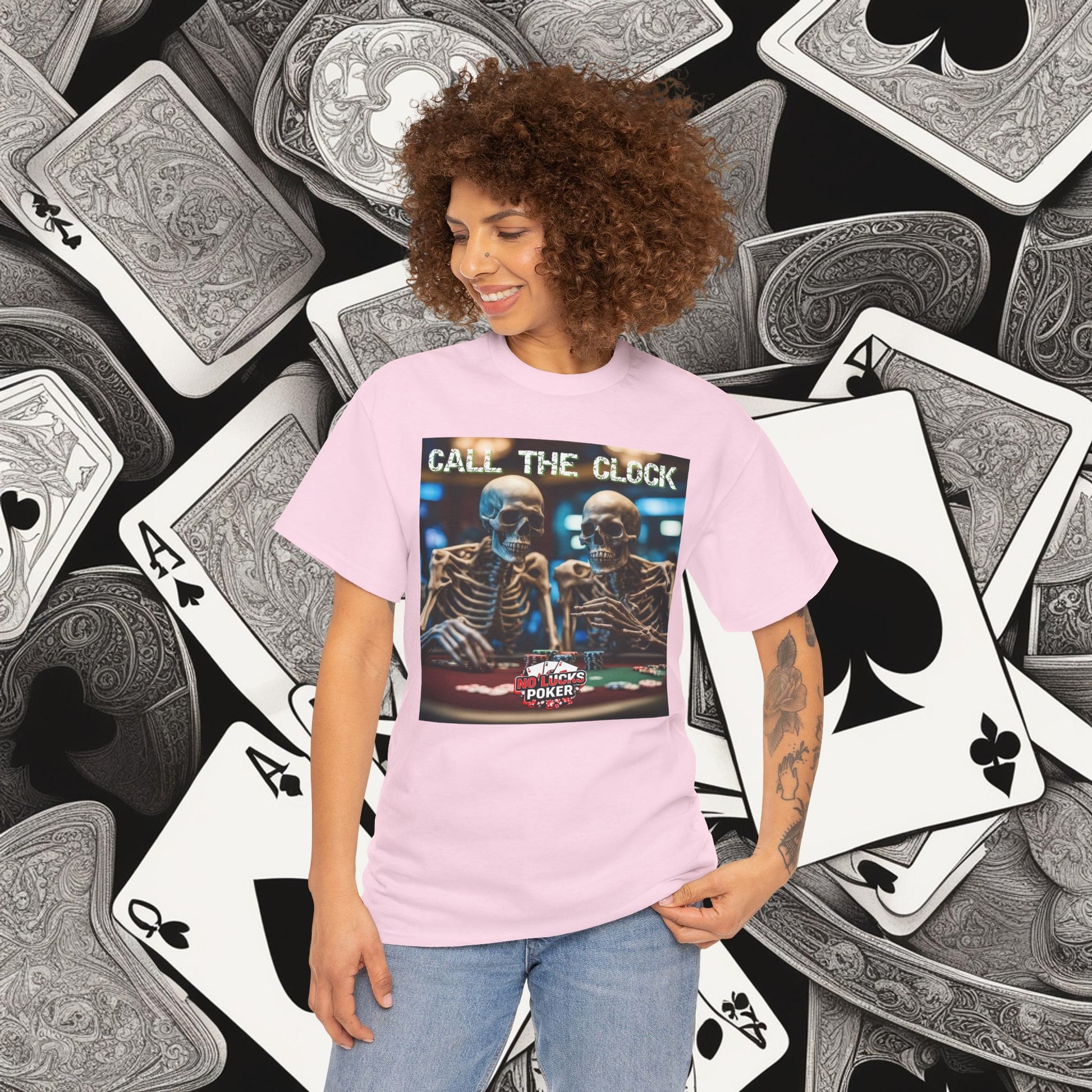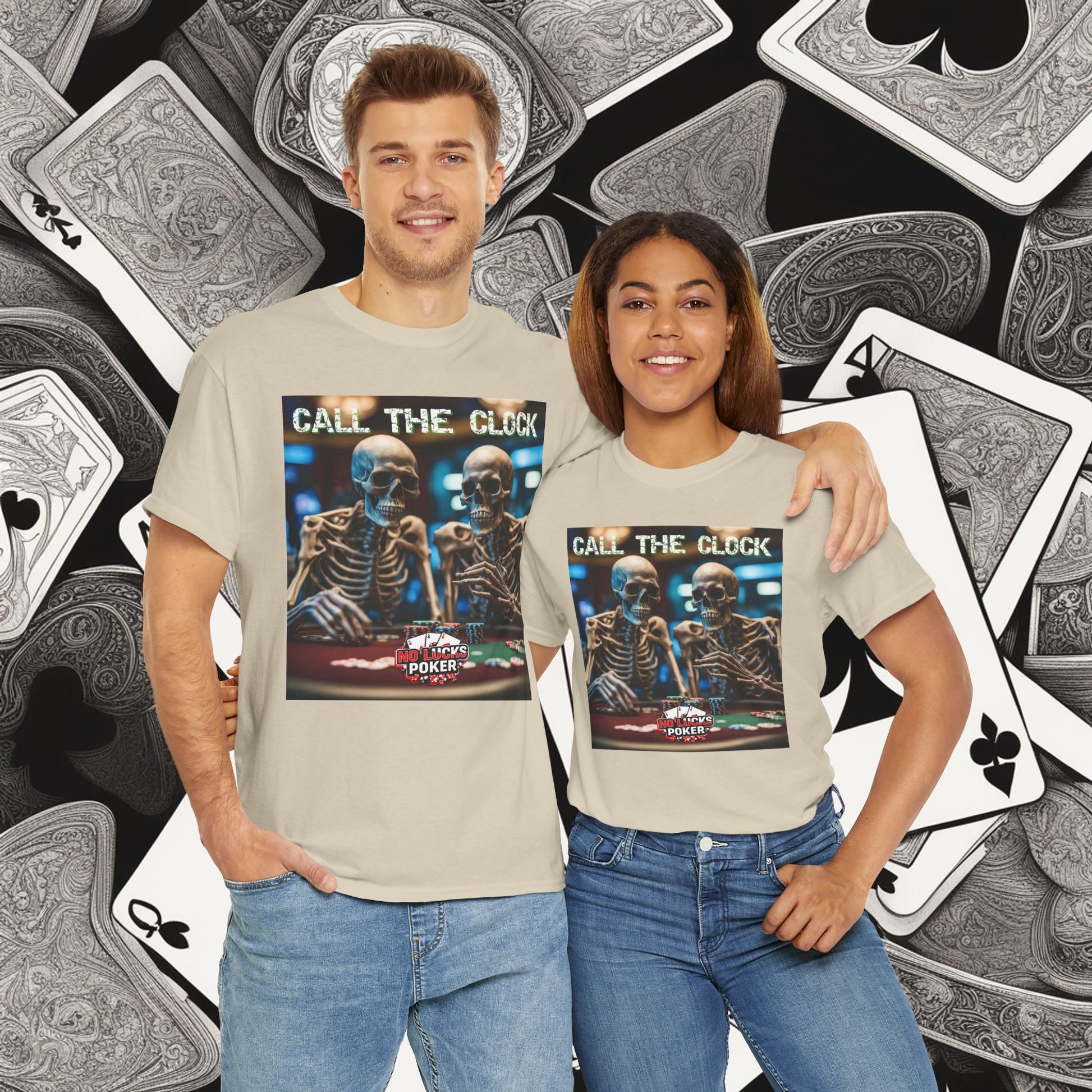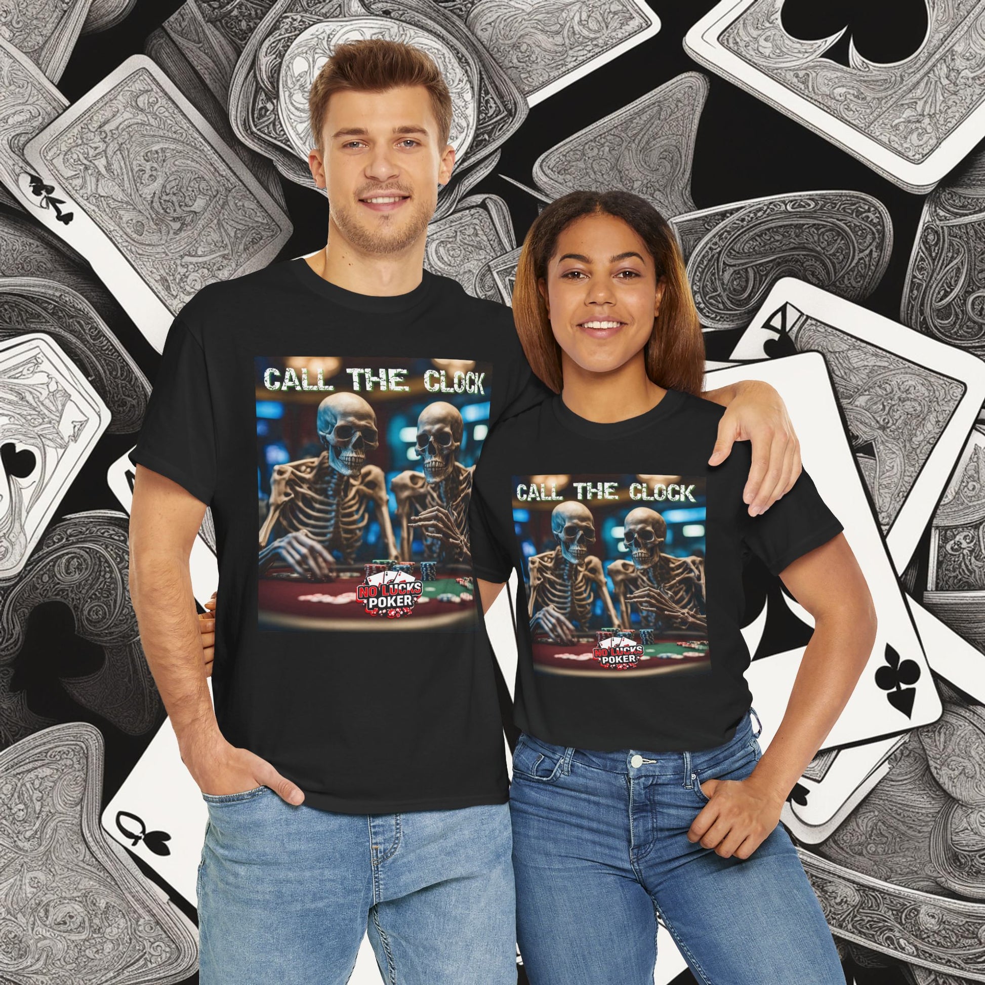 Step up your poker game with the "Call the Clock Skull" Unisex Heavy Cotton T-Shirt. Designed for players who live by skill and strategy, this tee embodies the fearless spirit of going all-in without relying on luck.