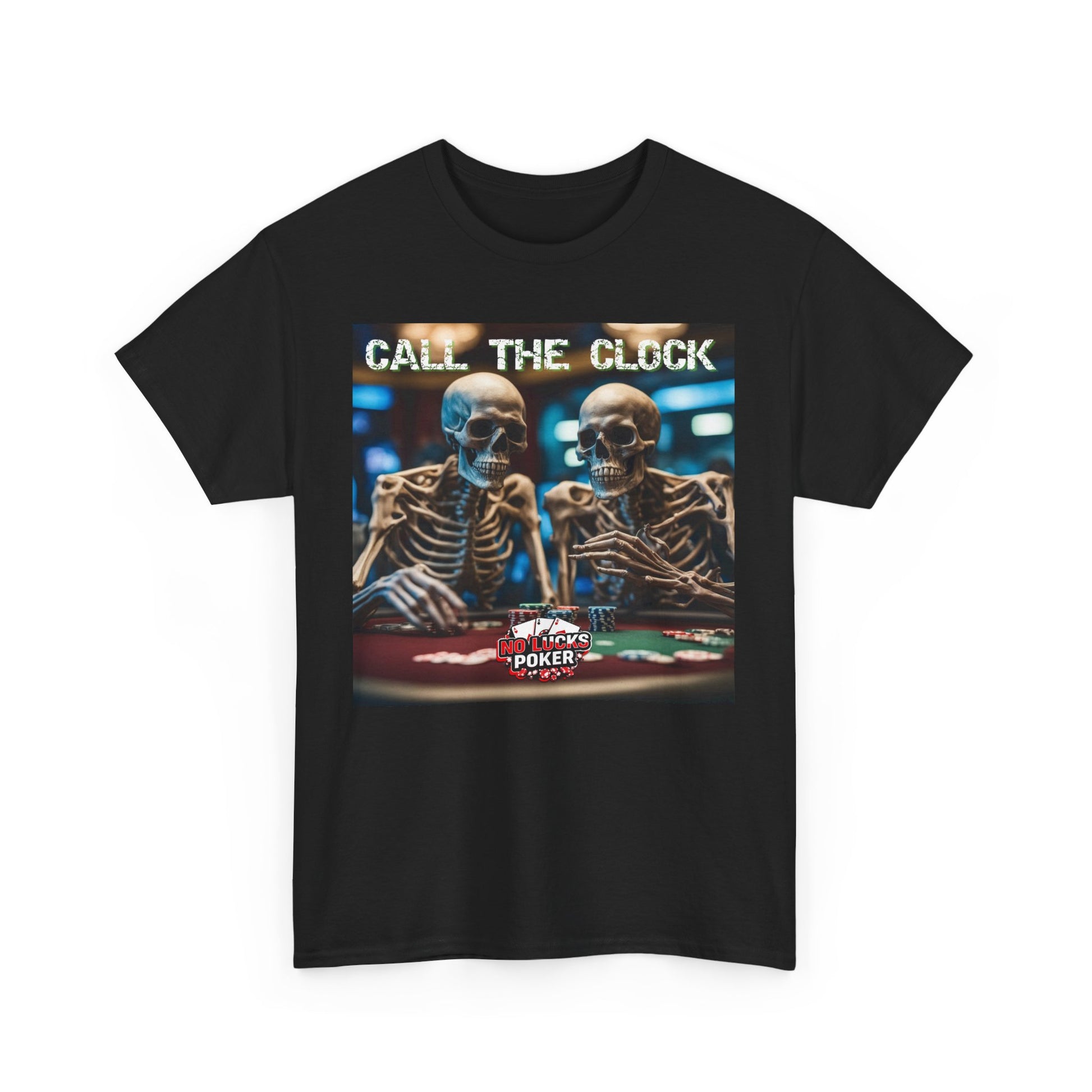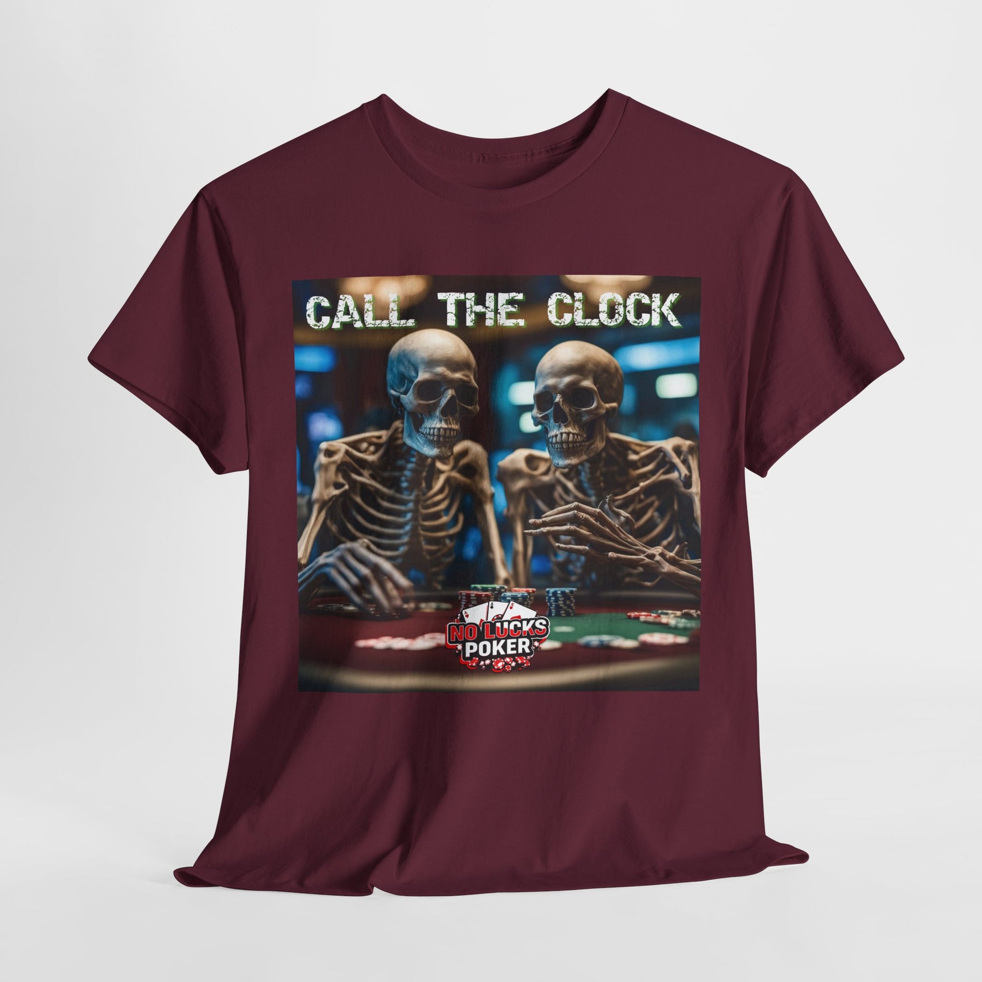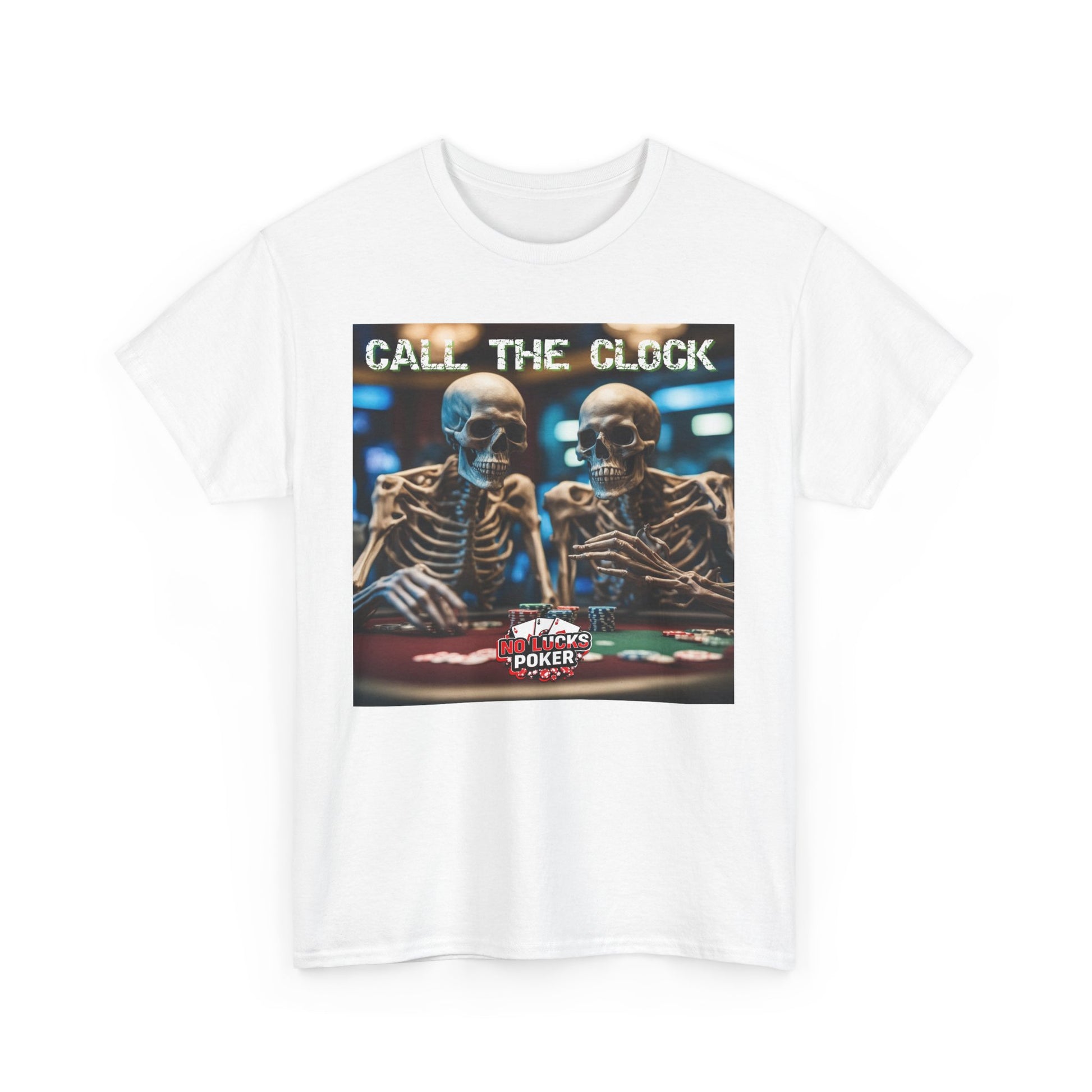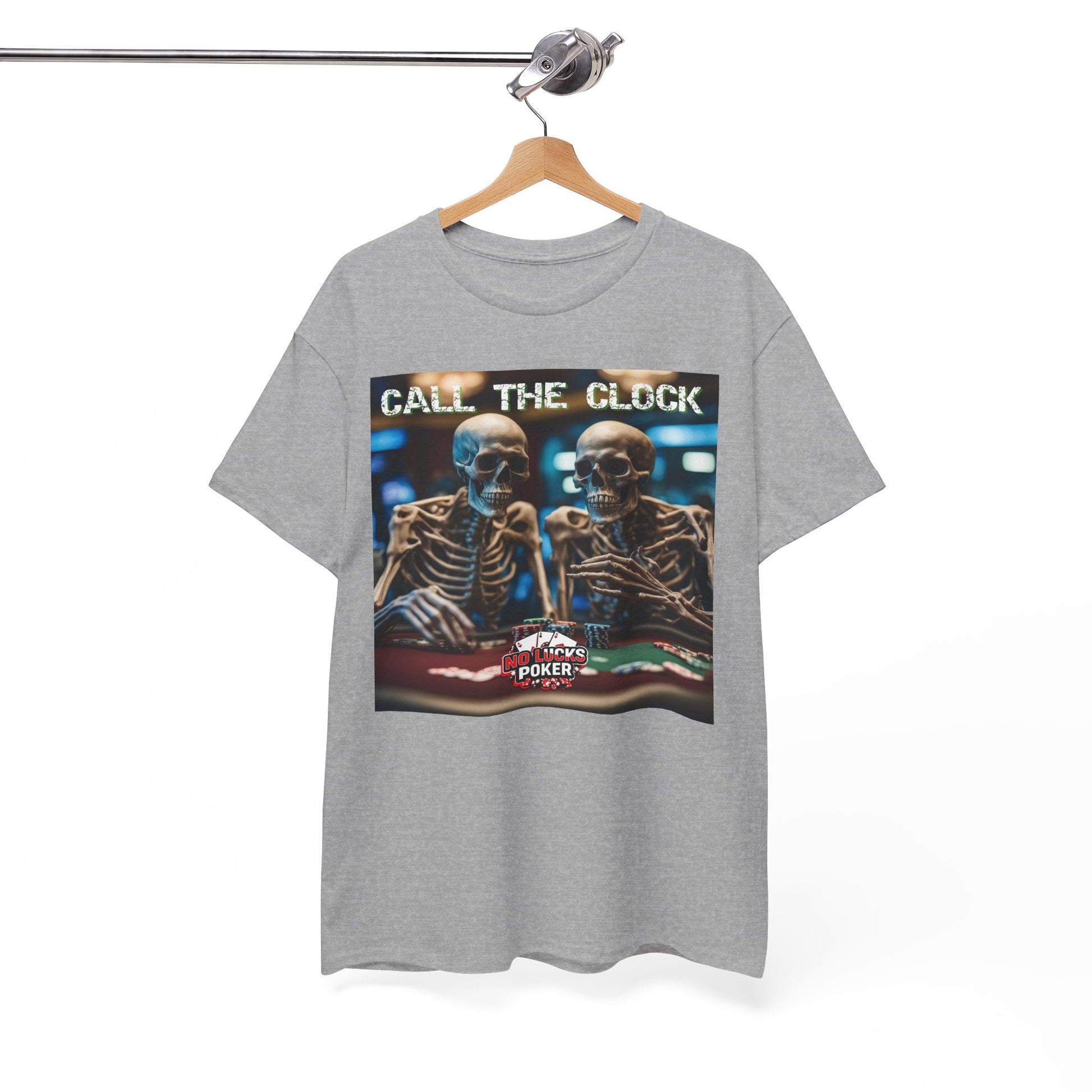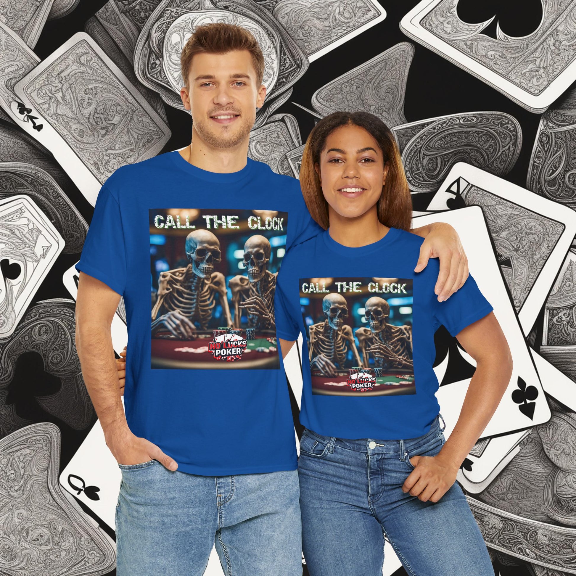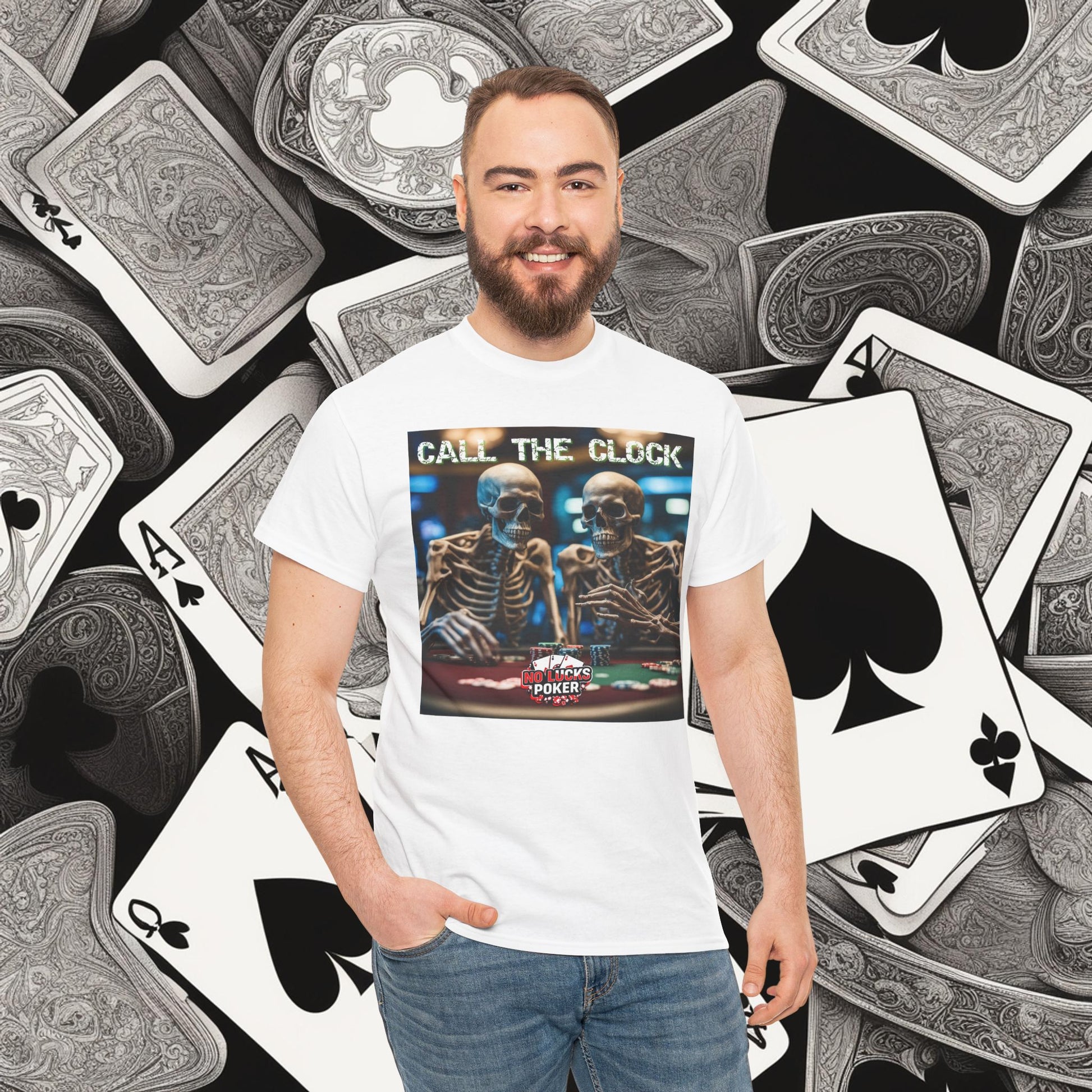 Step up your poker game with the "Call the Clock Skull" Unisex Heavy Cotton T-Shirt. Designed for players who live by skill and strategy, this tee embodies the fearless spirit of going all-in without relying on luck.