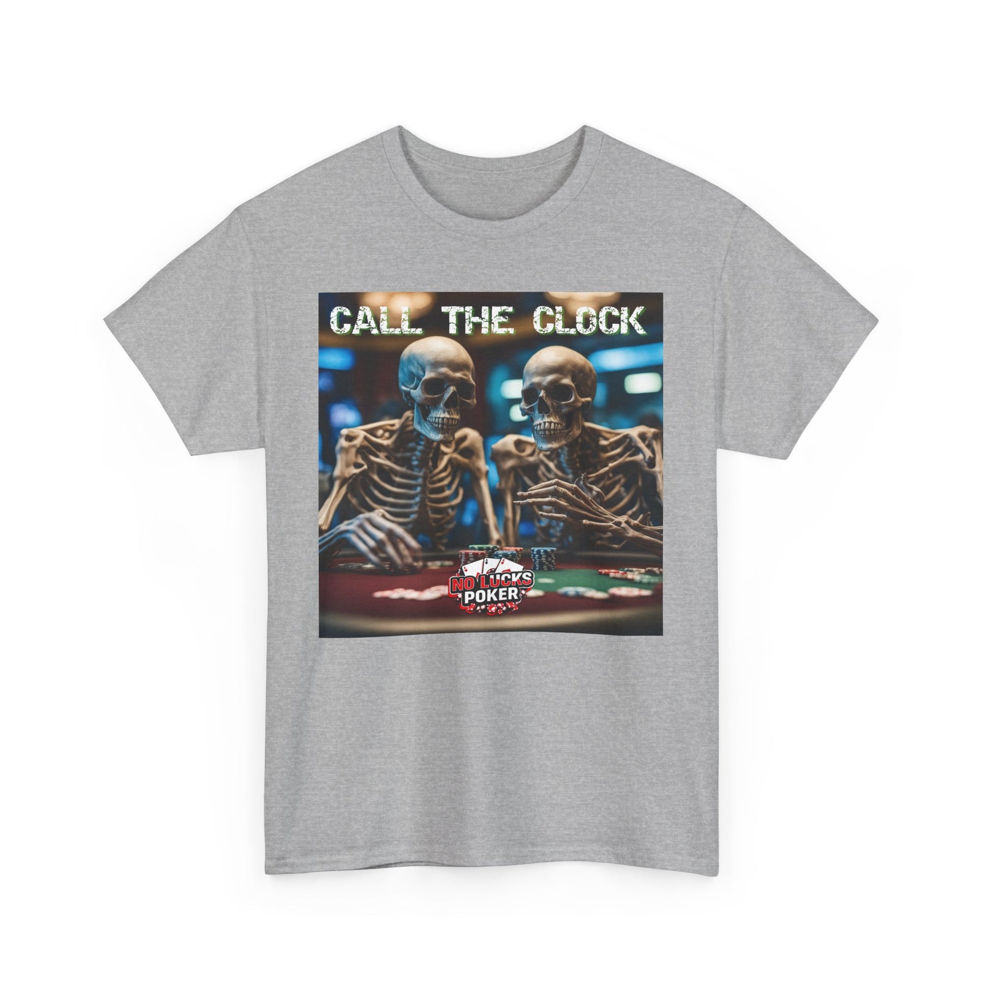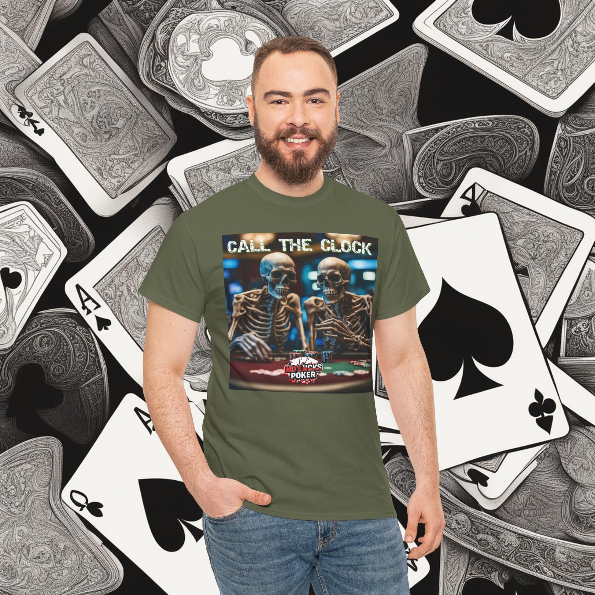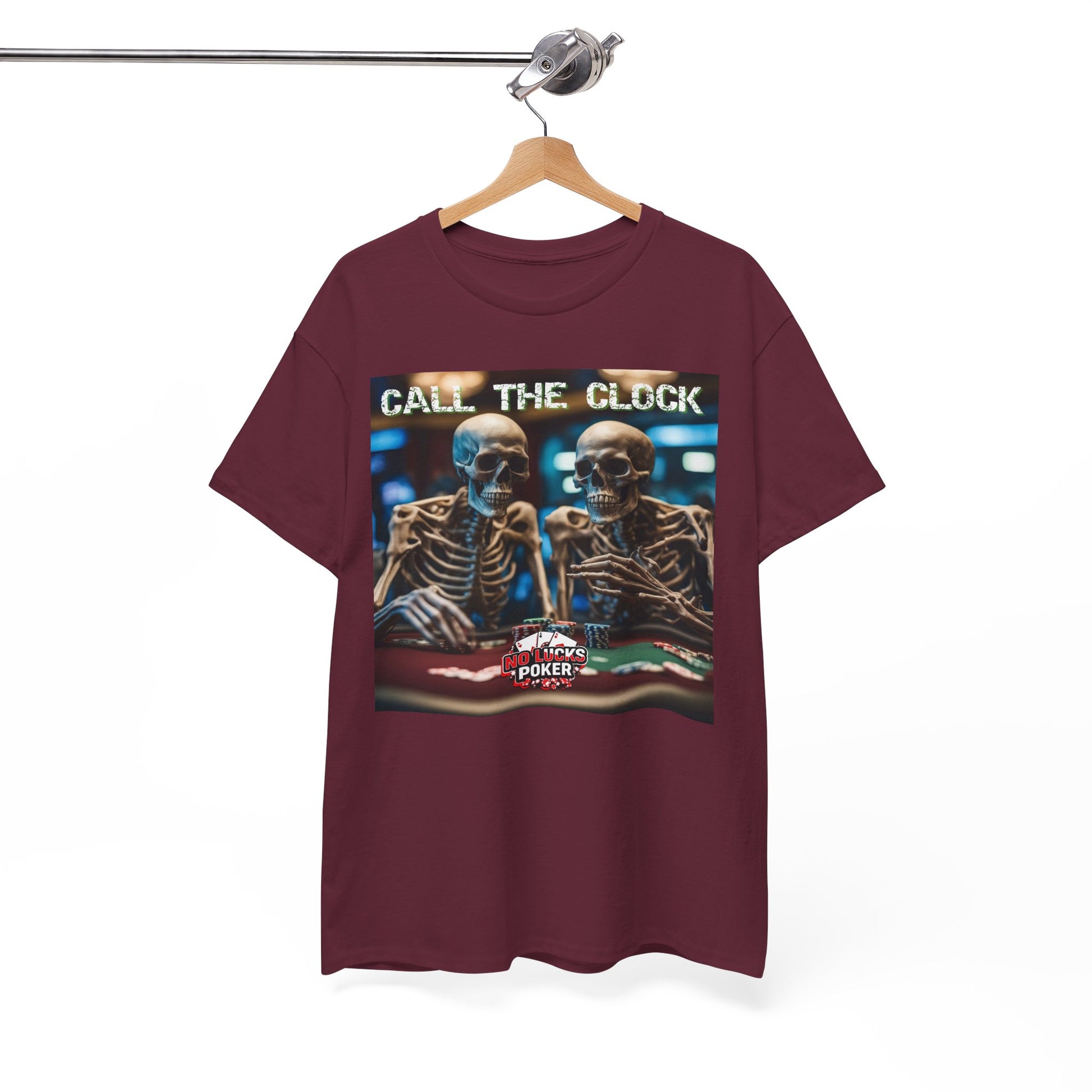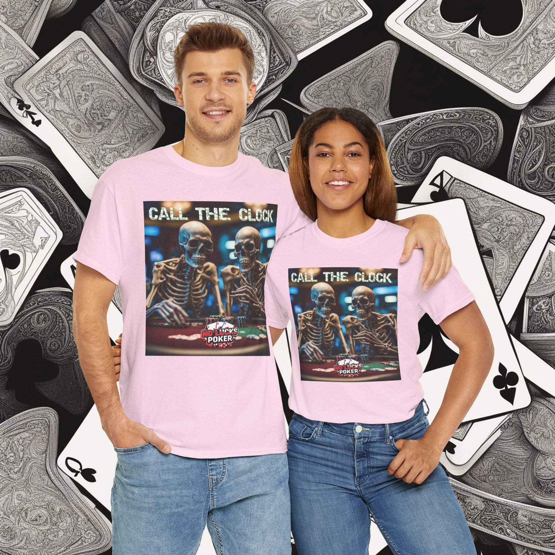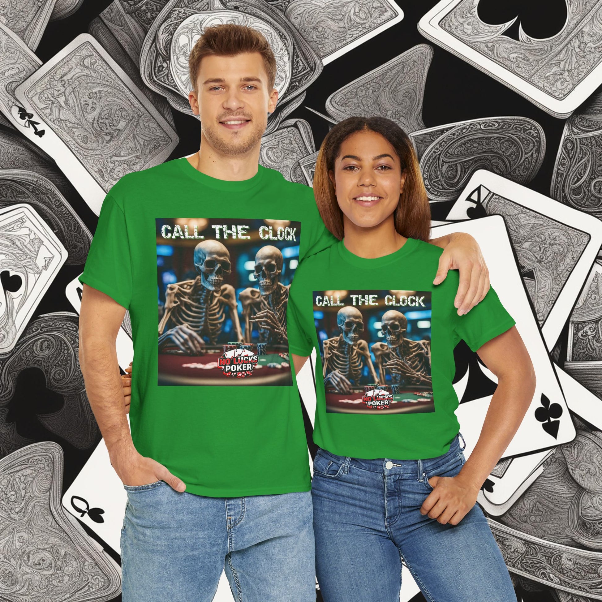 Step up your poker game with the "Call the Clock Skull" Unisex Heavy Cotton T-Shirt. Designed for players who live by skill and strategy, this tee embodies the fearless spirit of going all-in without relying on luck.